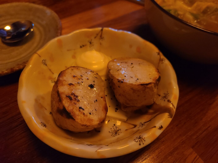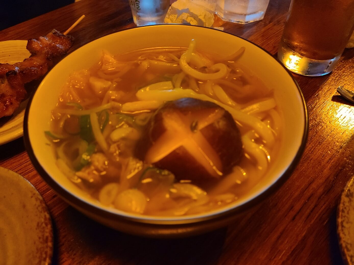 술과 먹을 거라면 꼭 시켜야 한다. 적어도 나는 다음에 또 시킬 것이다. 어떤 육수인지는 확실히 모르겠지만, 맛있는 콩나물국 같은 맛에 우동면, 국 사이사이의 채소가 술을 부르는 느낌이다. 나와 친구들은 두 그릇 시켰다.